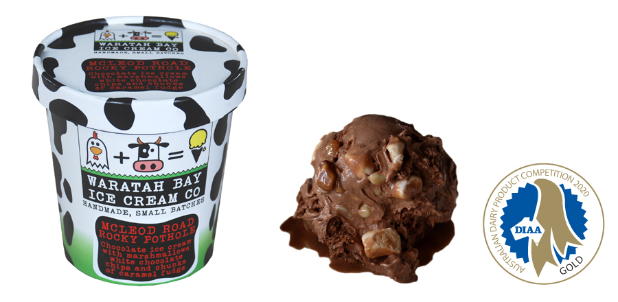 Chocolate ice cream with marshmallows, white chocolate chips and chunks of caramel fudge.