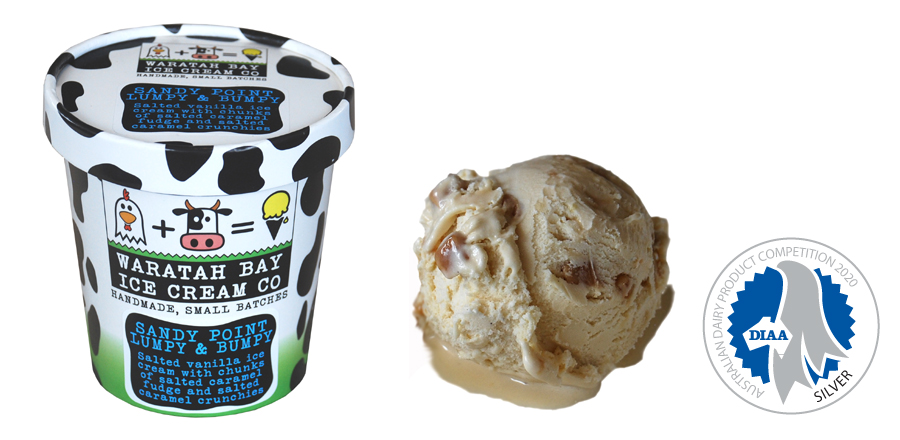 Salted vanilla ice cream with chunks of salted caramel fudge and salted caramel crunchies.