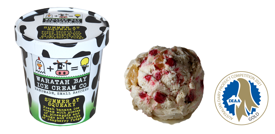 Fresh banana ice cream with pieces of pineapple and mango and chunks of raspberry fudge.